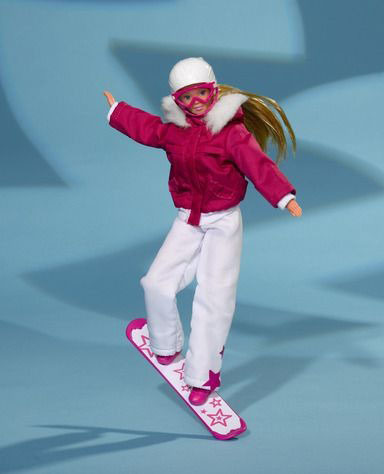 Lalka Steffi snow star, z deską snowboardową i akcesoriami w zimowym, modnym stroju.