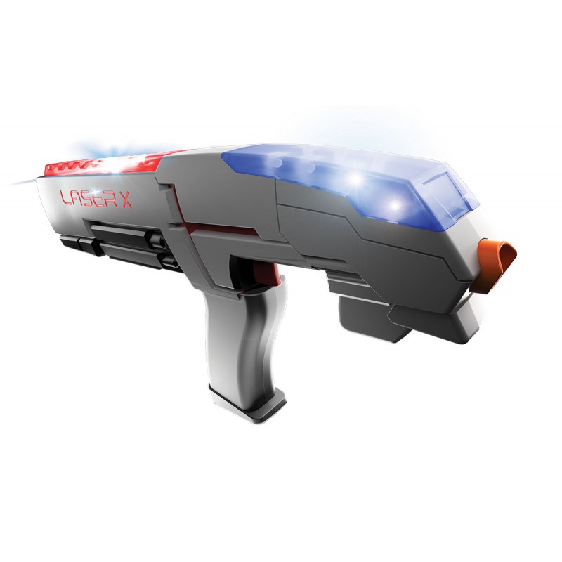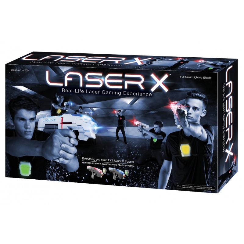 LASER X to niesamowita gra high-tech. Dzięki niej poczujesz się tak, jakbyś miał własną laserową arenę! Blastery mają zasięg 60 metrów, a kamizelka z czujnikiem zlicza celne strzały. Kolorowe efekty świetlne oraz dźwięki stereo z pewnością będą dodatkową atrakcją. Możesz grać jeden na jednego lub z większą, nieograniczoną liczbą graczy. Baw się wewnątrz i na zewnątrz! Laser X używa promieni podczerwonych, nie prawdziwego lasera.