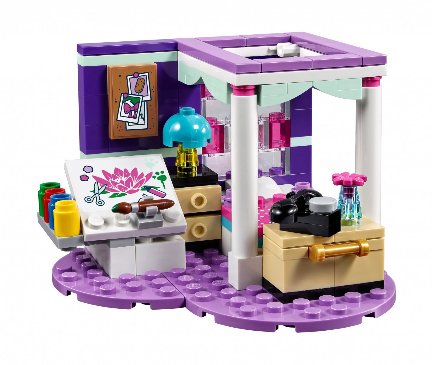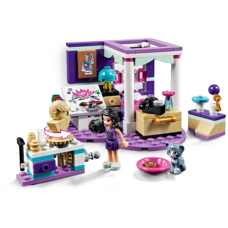 Zestaw LEGO® Friends 41342 Sypialnia Emmy ustawiony jest na fioletowej podstawce w kształcie serca i doskonale oddaje kreatywną duszę Emmy. W sypialni znajduje się piękne łóżko z kolumnami, deska kreślarska z farbami, koło garncarskie, specjalne siedzisko, na którym kot może pozować do zdjęć, oraz staroświecki telefon, z którego można dzwonić do przyjaciółek.